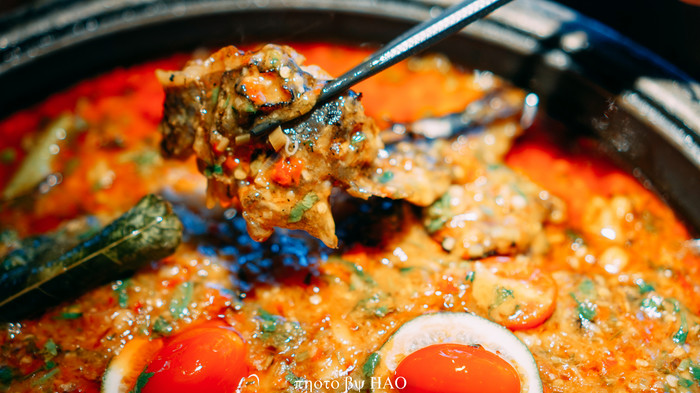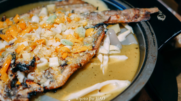 选择的黔鱼,肉多刺少,脂肪含量较高,特别适合拿来烤。鱼肉被烤的外皮酥脆,但肉质却十分的鲜嫩多汁,沾上一点汤汁后吹一吹送入嘴里,嘴巴里在响起了交响乐。