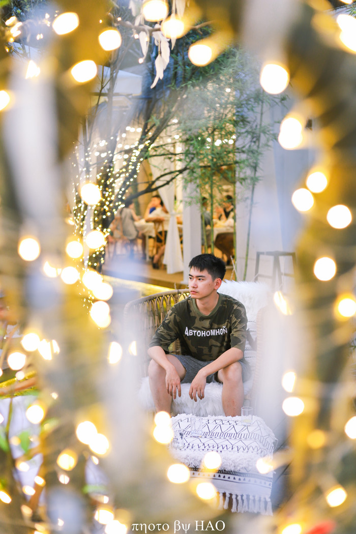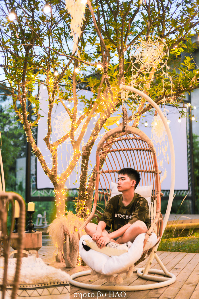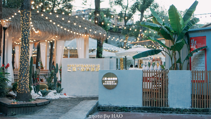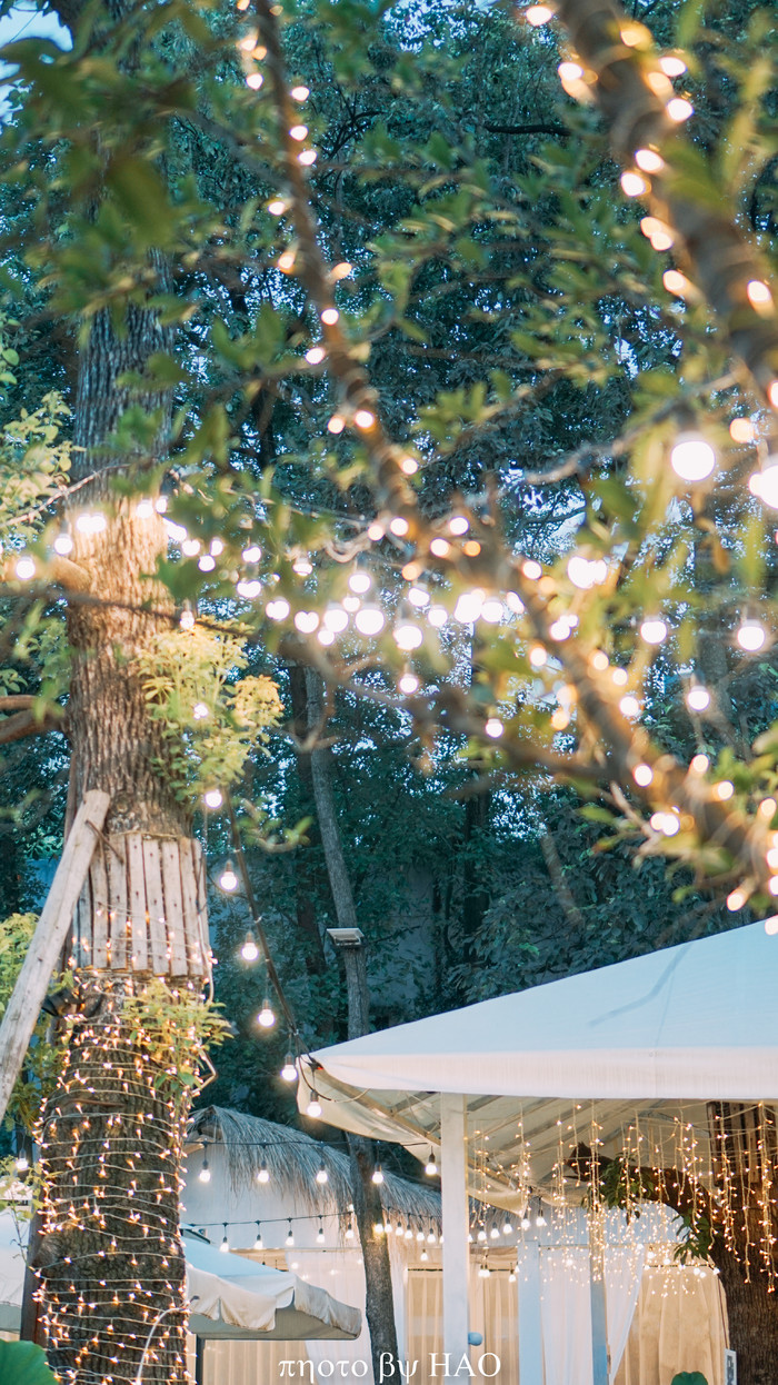 在密林的深处一个拐角,突然出现一大片纯白的光景。星星点点的梦幻暖黄灯带,蓬松的干草,洁白的帷幔,清新的热带植物。活脱脱就是一个小巴厘的感觉。仿佛自己瞬间穿越到了南纬1°那个热情迷人的海岛了。