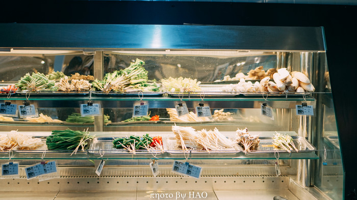 整整一长排的保鲜冷藏柜里明亮的摆放着堆放的干净整齐的菜品。蔬菜栏有清 新丰 富的素菜选择,冰柜里的盘菜也丰富分量足。