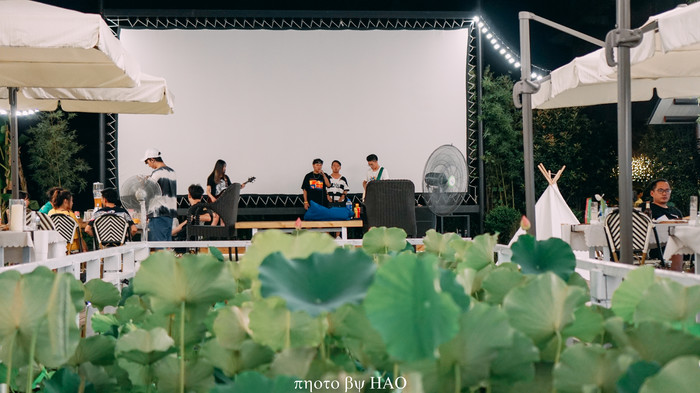 天黑了,今晚的大荧幕没有放电影,但是请来了乐队演出。不是激情活力的摇滚乐,也不是慵懒迷离的蓝调和爵士。节奏欢乐,鼓点律动,声音动人。真的是聚会时候十分合格的BGM。