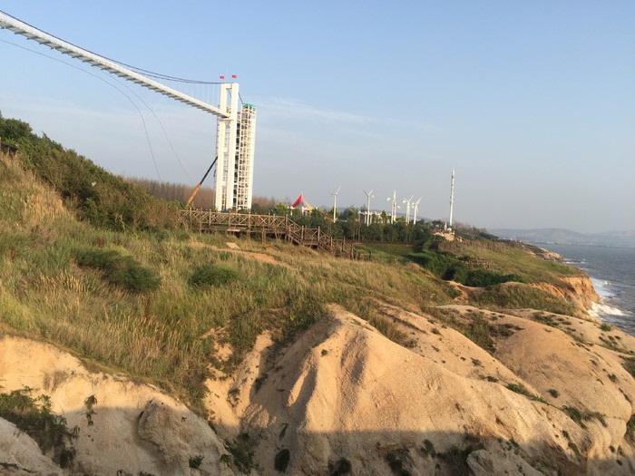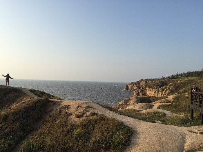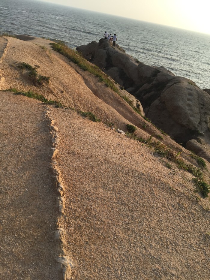 我把自行车放在上面,下来来到这个木头栈道上看看海蚀地貌,这种奇特景观,真是难以想象怎么一点点形成的。