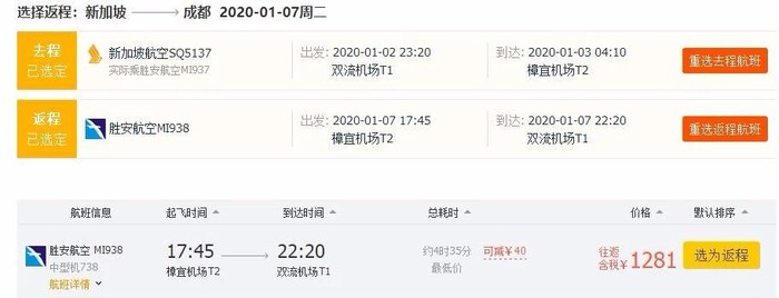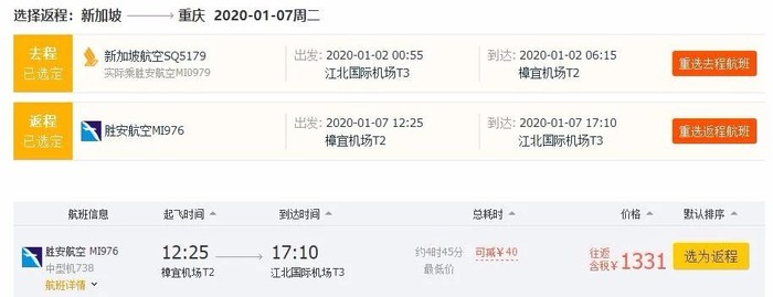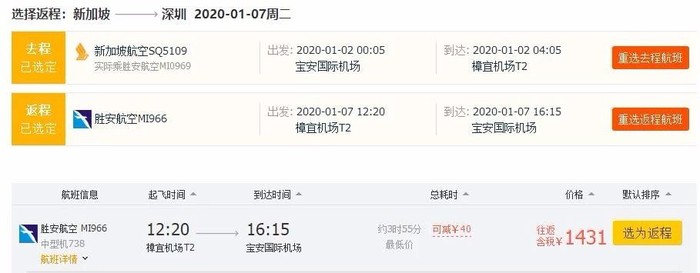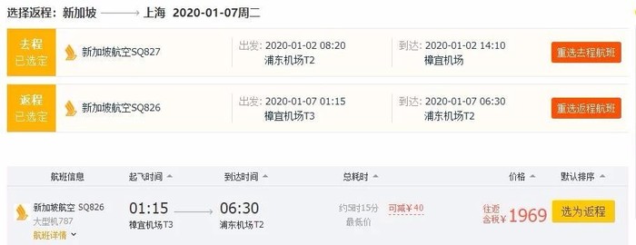 上海=新加坡,券后含税往返1.9K(上海出发一贯是新航最贵的);