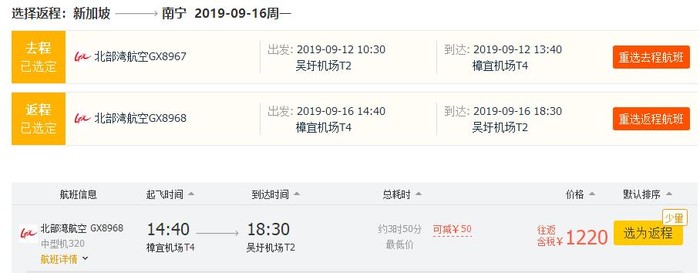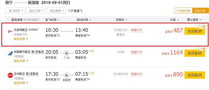 南宁=新加坡,券后单程含税437元;券后含税往返1170元;