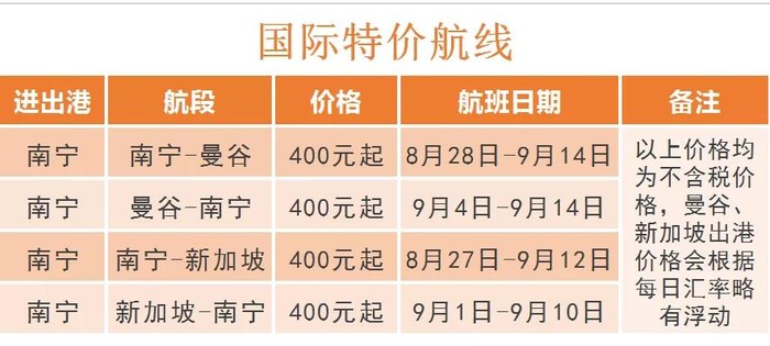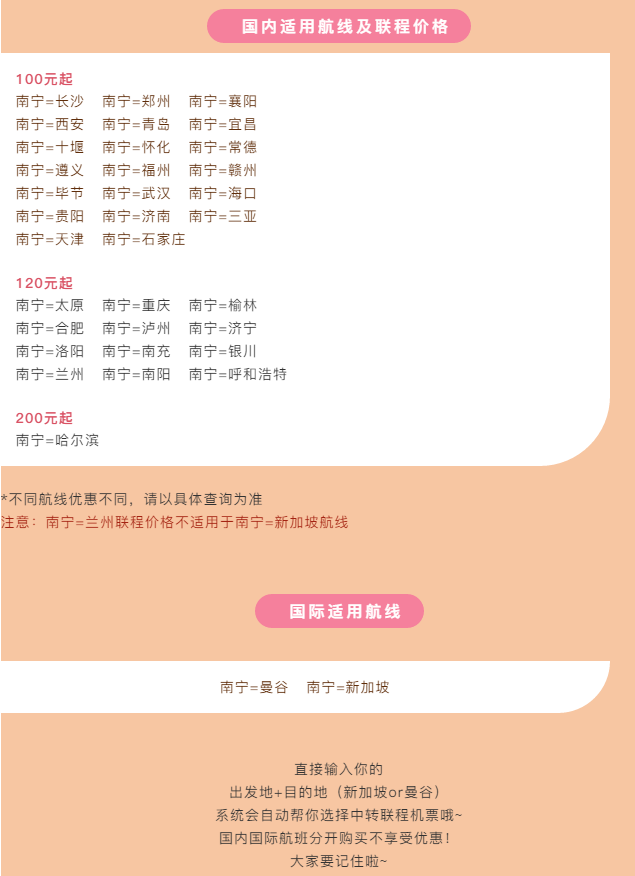 另外,从国内航点经南宁中转至曼谷/新加坡,国内段机票100元起,返程亦适用。搭配购买比直飞航班更优惠!