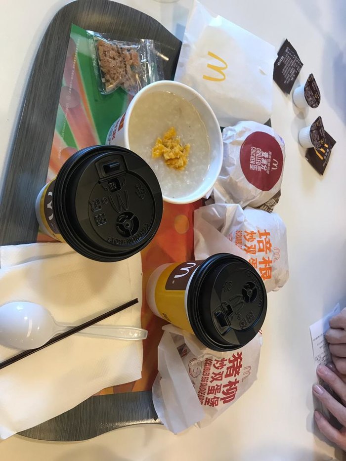 第三天的早餐,我们去附近的麦当劳享用早餐。中国的麦当劳大多都是开始自助点餐,因我们是外国游客,所以只能去柜台点餐。我们点了3份早餐和一碗粥,他们家的麦当劳饮料有提供豆浆和咖啡~吃完后,我们就去国贸地铁站F出口等一日游团(古北水镇),我们是在KKDay预订的,携程,马蜂窝也是可以预订的。