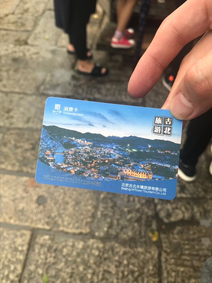 在古北水镇里有些地方是不能付现金的,需要买张消费卡充值,然后再消费。在美食街那边就可以买到这消费卡了。然后可以在同样的地方退还卡,不然走到大门口也可以退换卡,拿回剩下的余额。