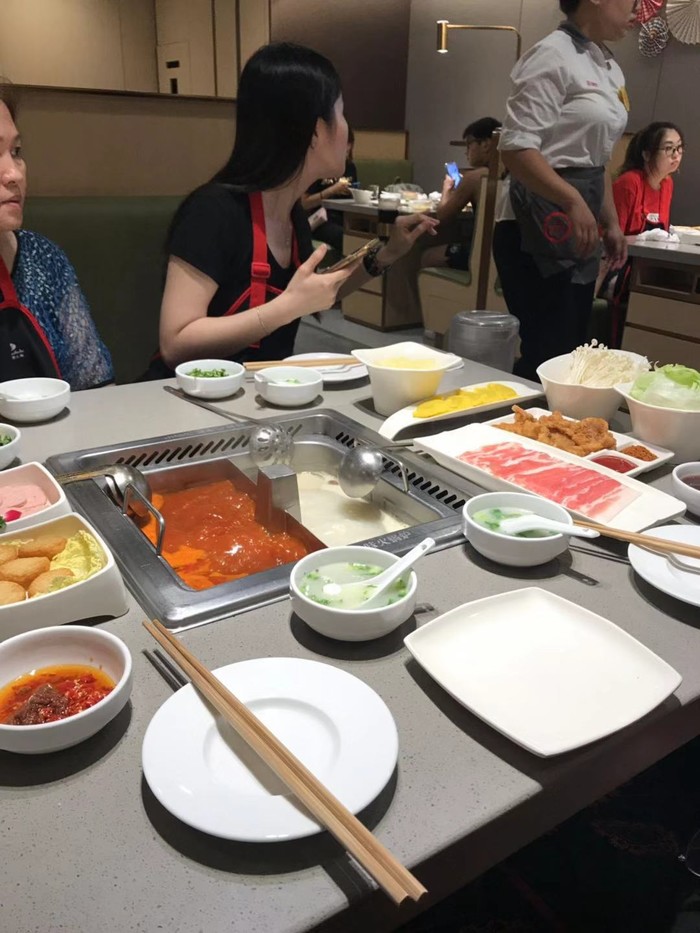 海底捞火锅是在4楼,乘搭电梯上去,一开电梯门海底捞员工就会很热烈的欢迎你,大包小包的东西会帮你提拿,然后寄放让你安心吃火锅。我们叫的汤底是番茄汁和三鲜火锅底料,这两种口味都适合我们。他们的送餐员是机械人会从厨房出来,然后由员工端上食物给我们,机械人就会叫你开心享用你的餐点。这是第一次在机械人的餐馆吃食物,一次新的体验。
