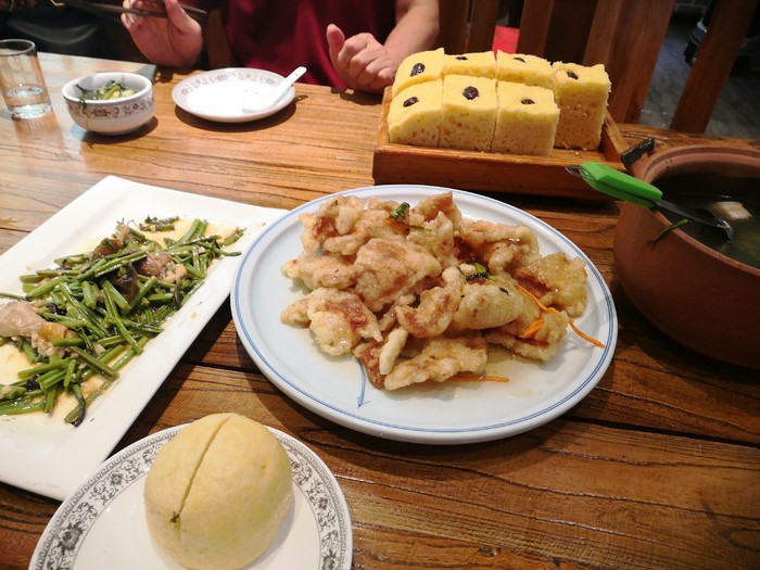 中午12点多,先解决了午餐再说。找到推荐的饭馆一九六八,等位人多,连个坐的地儿都没有,店家上菜速度很慢,早来的人菜还没上来,等了快一小时,终于翻桌了。招牌菜锅包肉,酸甜口,个人感觉有点腻,最后都剩下了。森林小炒,是当地的一种蕨菜,味道还可以。柳蒿芽土豆条这个汤,苦味中又带有一种香气,不太能接受。推荐小枣发糕和菜团子,好吃不贵。