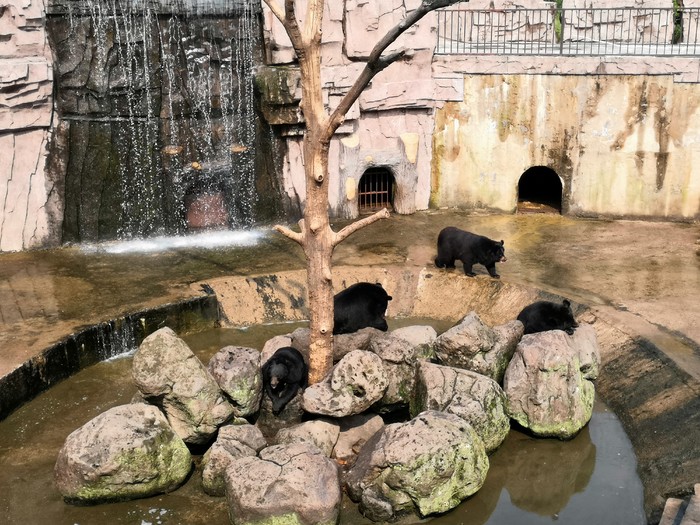 第二天雨后的清晨,泥土的气息让人神清气爽。宝宇龙花本身就是个大花园,草坪树木,满目青翠,桥下河水静静流向远方。沿河往北,台阶高处是熊山,棕熊和马来熊有七八只,看到有人来,就坐在地上抬头看着你,虽然阳光刺眼,它还是眯着小眼睛瞧,毛色黑亮黑亮的,看得出来伙食喂的不错。准备离开时,又有一家人上来,几个男孩子打闹着跑上去,不知道他们怎么淘气,惹得熊不断嚎叫,真是黑熊遇上熊孩子,熊落熊山被童欺。