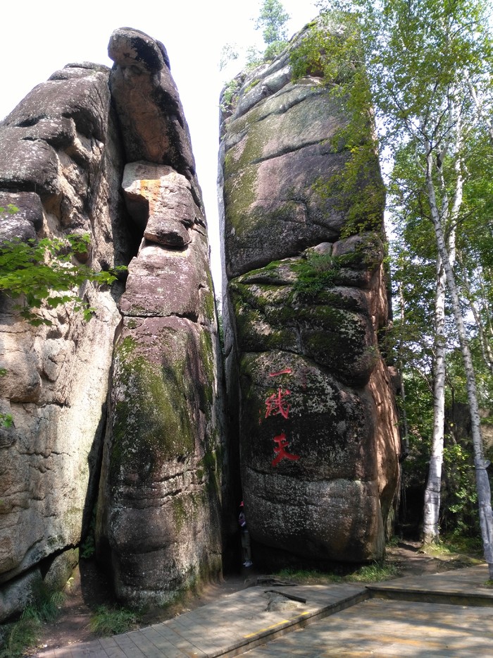 上午时间已过半,我们准备前往第二站——汤旺河国家公园,也是此行路程最远的景点。旅游公路去年才通车,虽然有的路段还在维护,但是整体路况还可以,车少跑起来很过瘾,两个多小时到达汤旺河国家公园。这是我国第一个国家公园,以稀有的花岗岩石林地貌景观和完善的原始生态为特色,植被繁茂,山色葱茏,空气中负氧离子高达每立方厘米5万个。65岁(含)以上老人免门票,观光车票要单独购买。公园有一线天、弥勒顶、植物苑、林海观音、幽谷探险五大景区,我们先来到最近的一线天。两座石峰形成了直上直下的一条缝隙,只能容一人侧身通过。它平地而起,挺拔高耸,是花岗岩石林地貌景观中的独特之处。