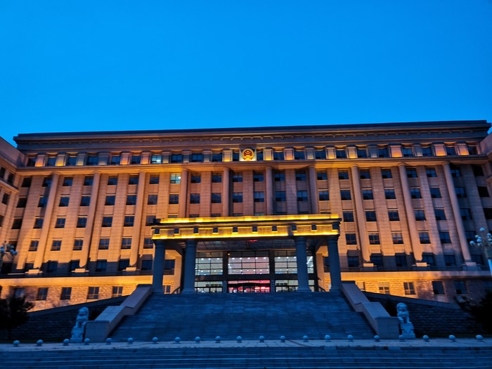 餐后漫步,酒店对面的大楼庄严肃穆灯光辉煌,原来是伊春市政府大楼。大楼是开放式的,没有大门,也没有门卫站岗,楼前广场可供人们休闲散步。