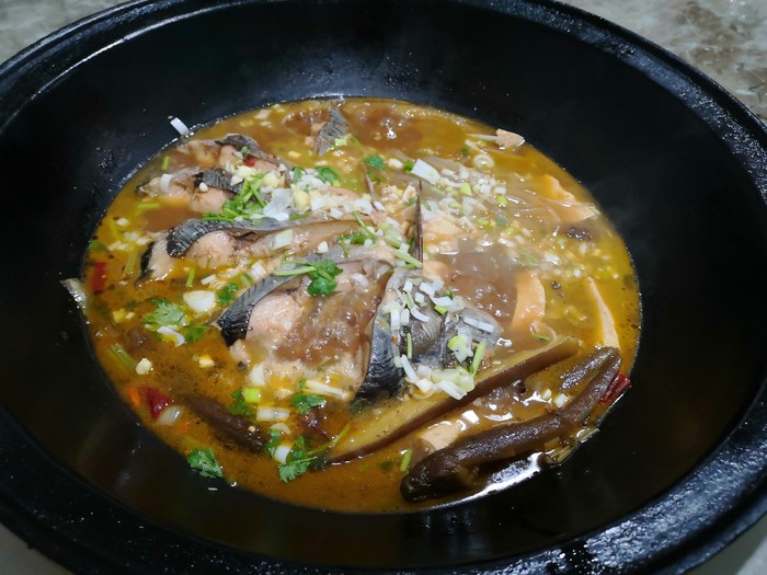 晚餐是推荐的老渔翁笨锅炖,四斤重的三道鳞,满满一锅,好吃不贵。