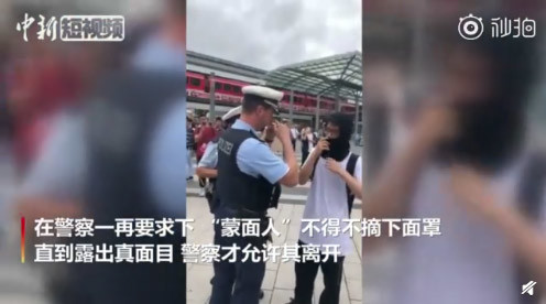 @中国新闻网:8月17日,有留学生和海外侨胞在科隆市自发举行“爱国护港”集会,在现场,有带着面罩的香港示威者,德国警察要求蒙面者摘除面罩,在警察的一再要求之下,这位“蒙面人”不得不摘下自己的面罩,露出自己的真面目,直到其摘下面罩,警察才允许其离开。