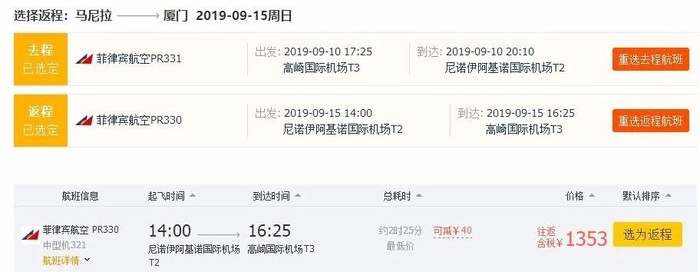 厦门=马尼拉,券后含税往返1313元,跨中秋;
