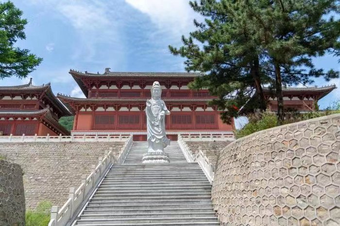 山海禅寺,可以听到历史的声音。这里位于祖山中间,画廊谷西边,风水极佳,冬暖夏凉。从下面顺着台阶往上走,可以看见正中间摆着一座汉白玉观音像,旁边是林荫大树,观音的背后就是寺庙,红墙绿树,怡情怡景。