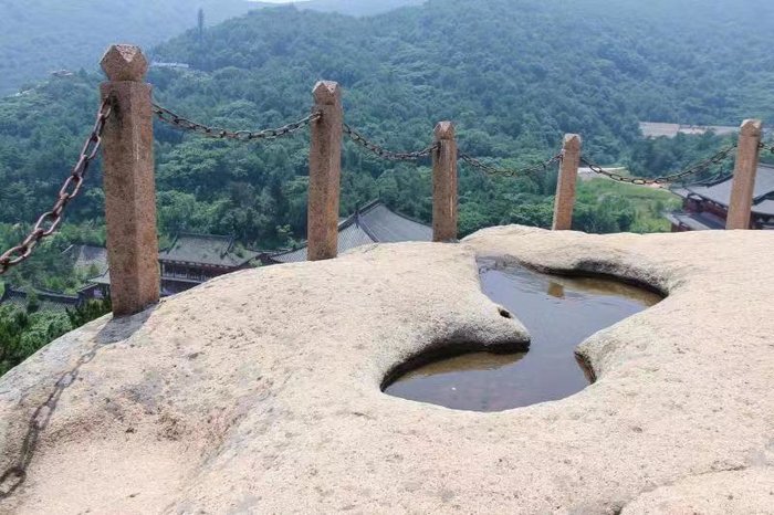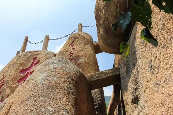游览完山海禅寺,我们顺地势去了旁边的天女云床,天女云床上面有两个浅浅的坑,据传是仙女在画廊谷洗完澡,晒太阳的地方,从这里能俯瞰到山海禅寺和祖山宾馆。