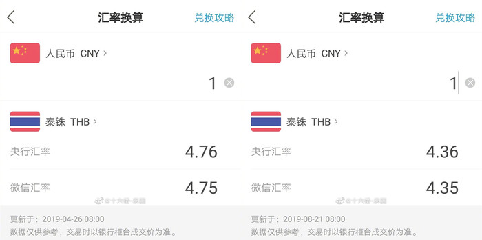 最近汇率真是糟心,就拿人民币兑泰铢来说吧。4月底的时候人民币兑泰铢为1:4.76,现在1元人民币只能兑换4.36泰铢了...