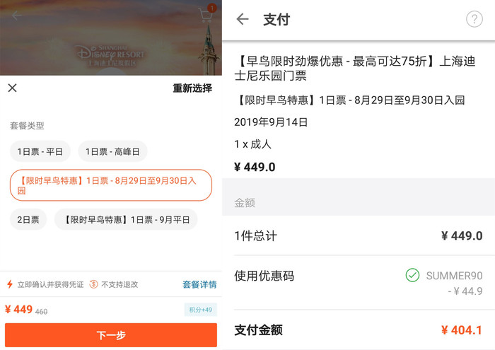 如果想在8、9月的节假日前往,小番比较了一下,选择“【限时早鸟特惠】1日票-8月29日至9月30日入园”更划算。官网售价575元,KLOOK上价格为449元,同样可以使用9折优惠,打完折之后只需404元,比官网省了126元!