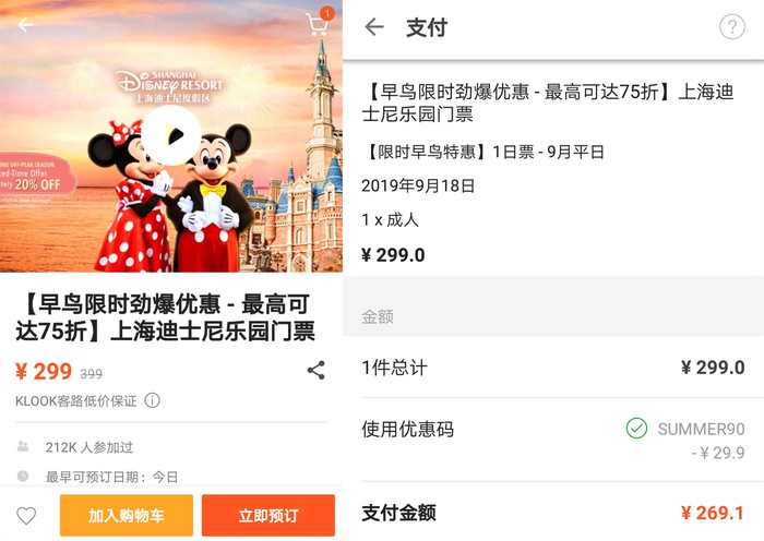 上海迪士尼1日门票,如果是平日去,官网售价399元,KLOOK上价格为299元,另外还可以用9折优惠,打完折下来,269元,比官网省了130元!所以小番叫你们别老是犹豫,因为是真的划算呀!