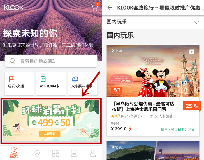 进入KLOOK客路App首页后,就能找到「环球消暑计划 满499-50」的活动页面入口。选择想预订的门票,提交订单时在“使用优惠码”一栏填写相应的折扣优惠码,就能打折啦!
