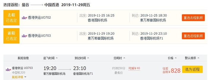 香港=曼谷,券后含税往返778元;