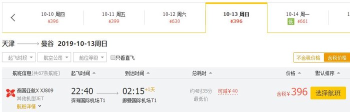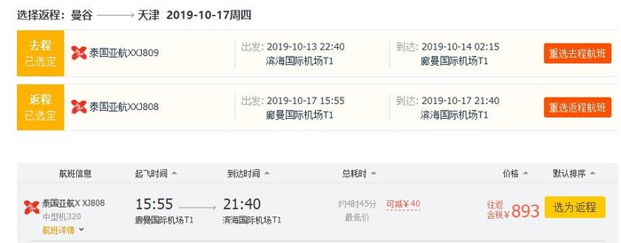 天津-曼谷,券后单程含税356元;往返含税853元;
