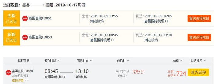 揭阳=曼谷,券后单程含税684元;