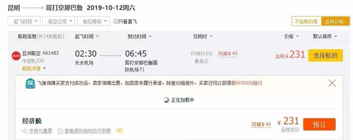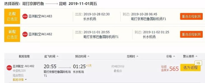 昆明=亚庇,单程含税191元;往返含税565元;