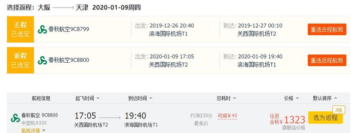 天津=大阪,券后往返含税1.2K,跨年元旦;