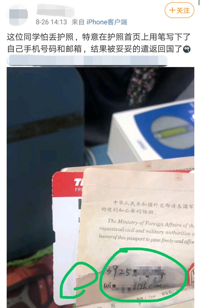近日,小番看到一网友分享:在护照首页上用笔写下了自己手机号码和邮箱,结果被妥妥的遣返回国了。