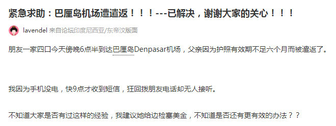 据《劳动报》报道,李先生本想趁国庆长假结束,错峰和朋友一起去印度尼西亚巴厘岛旅游,从网上了解到该国可以办理落地签证,于是便和朋友买好往返机票兴致勃勃的登上了去巴厘岛的航班。“出行前我也注意到护照快到期了,但想着毕竟还在有效期之内,而且如果去延期的话怕赶不上这次旅行了”,李先生说。当时忙着买机票订酒店,因此,护照的事他也没放在心上,没想到一到达巴厘岛办理入境手续时,却因所持护照的有效期不足六个月而被拒绝入境,并被遣返回浦东机场。