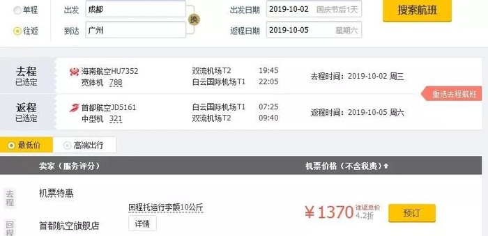 9、成都=广州,含税往返1.4K,10月2日-10月5日;