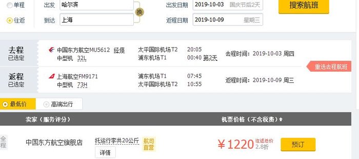 6、哈尔滨=上海,含税往返1.3K,10月3日 -10月9日,需要请两天假;
