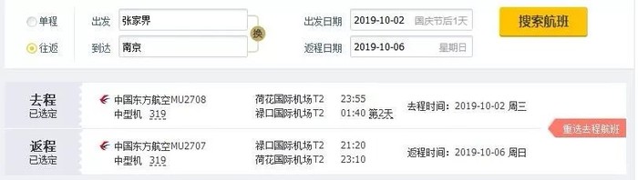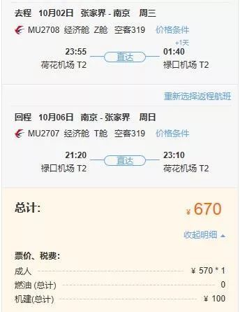 1、张家界=南京,含税往返670元,10月2日-10月6日;