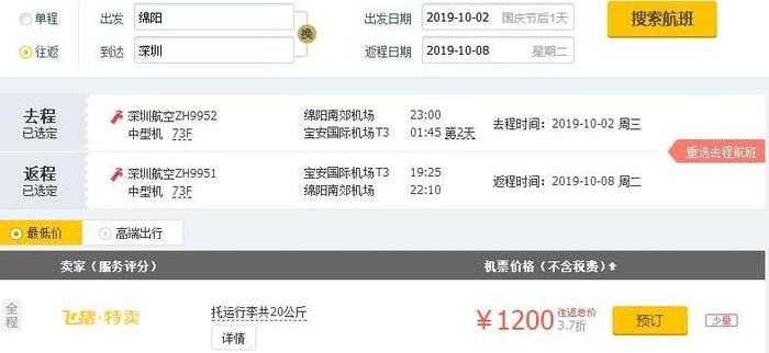 10、绵阳=深圳,含税往返1.3K,10月2日-10月8日;