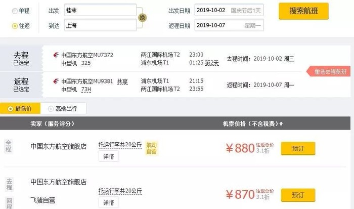 4、桂林=上海,含税往返970元,10月2日-10月7日;