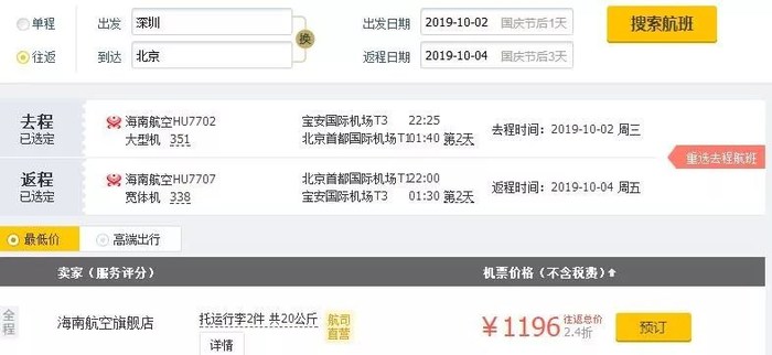 7、深圳=北京,含税往返1.2K,10月2日-10月4日;