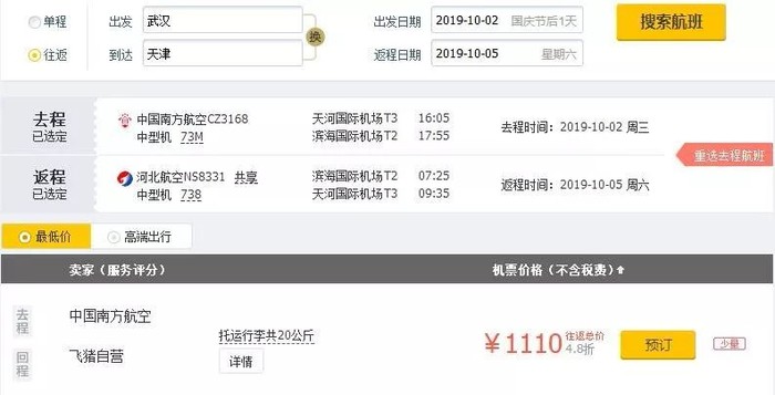 8、武汉=天津,含税往返1.2K,10月2日-10月5日;