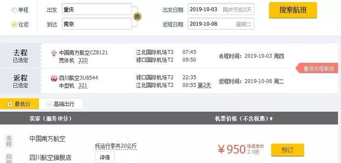 5、重庆=南京,含税往返1K,10月3日-10月8日,需要请一天假;