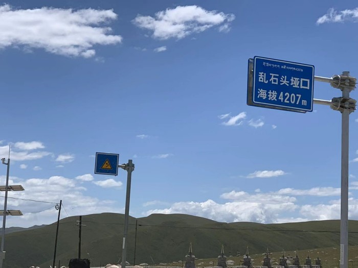 出色达,往年龙乡方向走色年路,这段可以狂奔,宽敞平直、翻过4239米扎拉山垭口,4418米德啄山垭口进入青海,一会就到班玛县知钦乡,青海段全程碎石路和破烂水泥路,137公里路到班玛县用了35升油,从色达到班玛县海拔累计上升1522米,累计下降1909米,沿途也是高山草原。