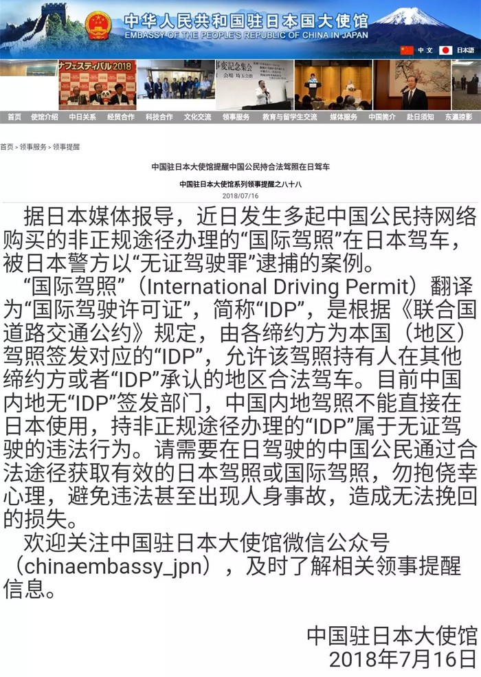 据中国驻日本大使馆网站消息,去年7月发生多起因中国公民持非正规途径办理的“国际驾照”在日本驾车最终被日本警方逮捕事件,也让“国际驾照”再一次成为微博热门话题。
