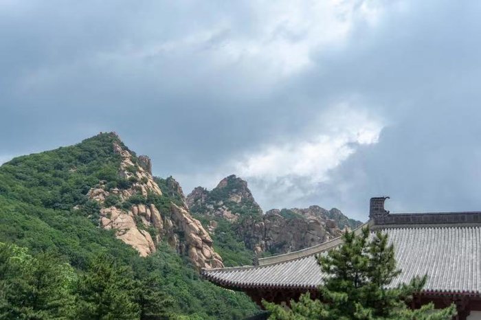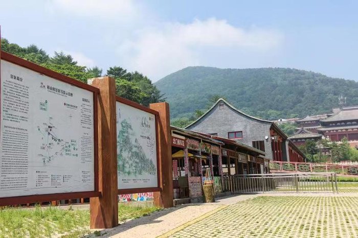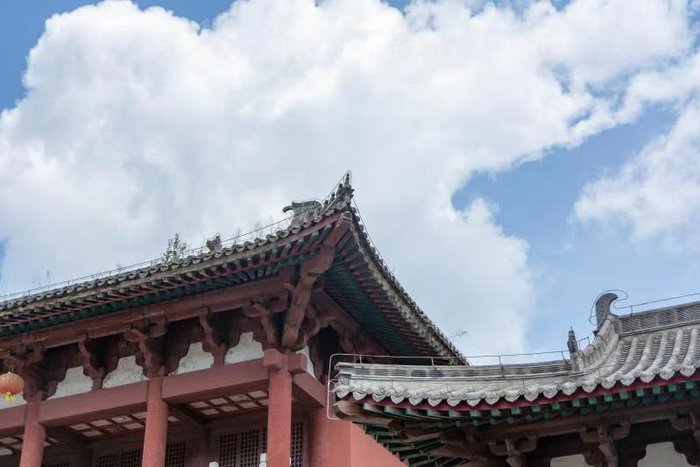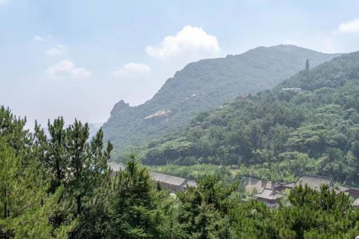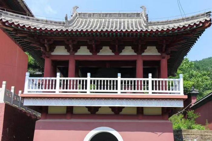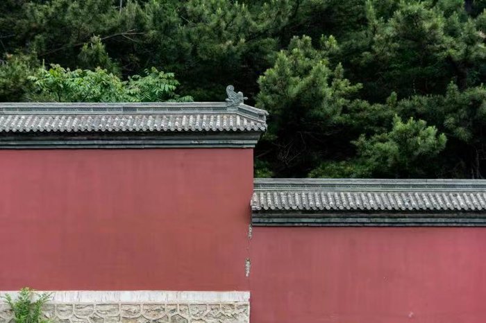 下了缆车,我们便到达了山海禅寺。黄色的琉璃瓦,红色的砖墙,给人一种庄严肃穆的感觉,瞬间让我想起了曾经游过的故宫。在古代,人们认为中华民族起源于黄土高原,黄色代表尊贵,而红色则象征着喜庆,故中国古代的建筑多以黄色和红色进行装饰。红色的砖墙又与绿色的树林相映相衬,严谨中透漏出一丝活力,十分生动。