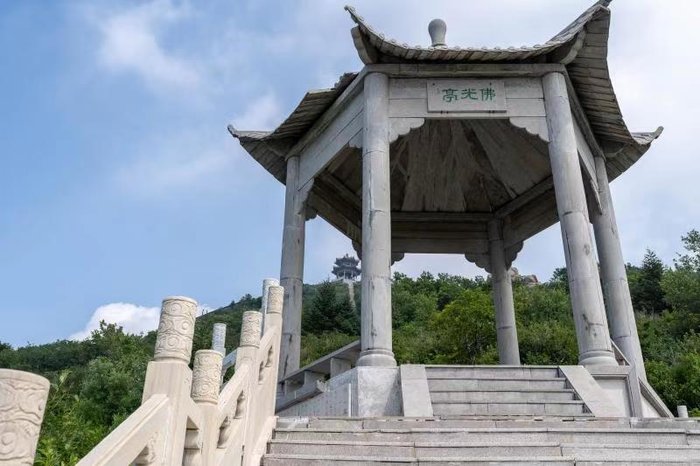 峰回路转,有亭翼然临于山上者,佛光亭也。在通往山顶的路上,有三个小亭供游客参观休息,三亭一线,从高空望来,也是十分有趣。