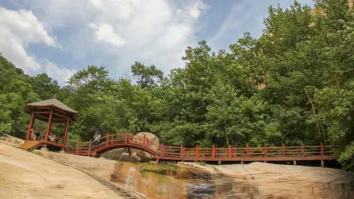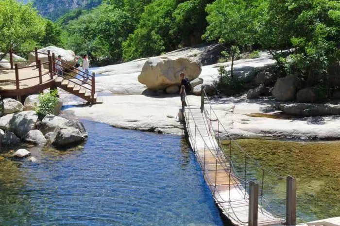 转过几段坡路,水声轰然,路边白浪翻卷,一股激流从乱石堆里奔涌而来,击起团团水雾。稍远处,平静的水面上,一木制小桥横跨其上,连接着巨石上的亭台,供游人嬉水拍照。