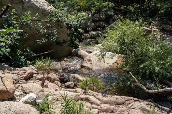 不宽的路旁巨石耸立,树木丛生。有些树根经年冲刷,裸露在外,似乎随时都要倒下来,实则坚固傲立。偶尔有石头堆砌的平台供人休息歇脚,山间荫蔽遮天,微风习习,很是舒服。