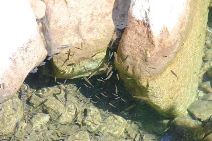 通往亭子的桥面有部分浸在水中,或从桥上“冒险”,或从旁边绕行。朋友伸手感受山间清泉,真是寒凄骨。拿出早上切好的西瓜,连着袋子放入水中,朋友得意地冲着我说,“马上请你吃冰镇西瓜!”我也调侃着他说道,“你可别馋坏了水里的小鱼儿们,把咱的西瓜吃了。”这样一个风趣的朋友,为路途增添了不少乐趣。