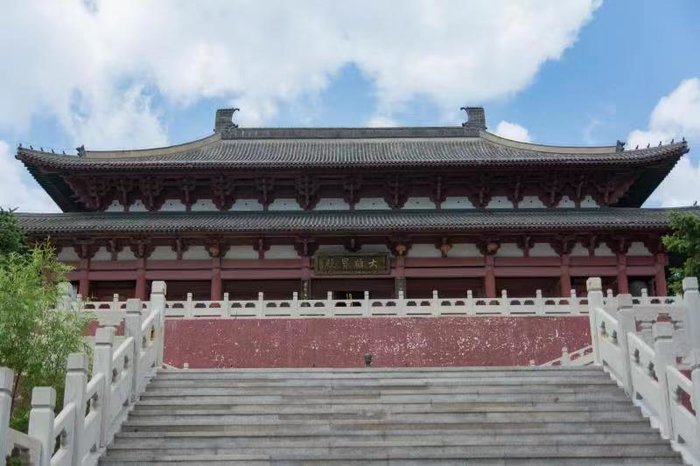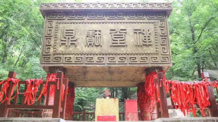 吃过这冰镇西瓜,更觉山间清爽,一度沉醉在祖山翠绿之中。再前行几十米,一尊巨鼎盎然立于道旁,金光闪闪、气派十足,边走边观赏,鼎身上还书着“禅堂宝鼎”四个篆字。