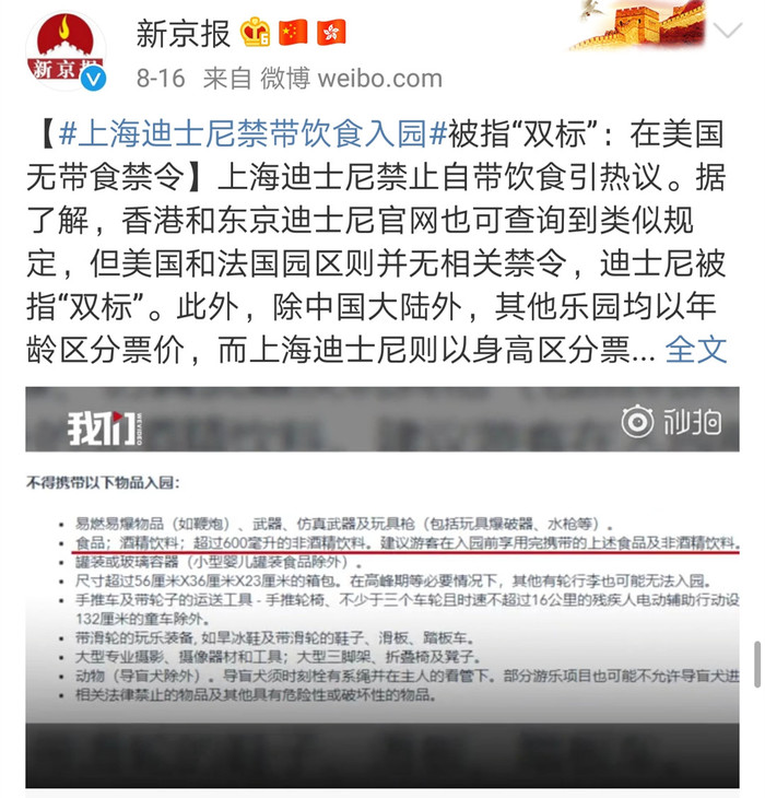 这一点,也引发了网友认为有失公平的议论。@人民网 刊发《四问上海迪士尼:翻包、“双标”,凭什么?!》,也登上了热搜。