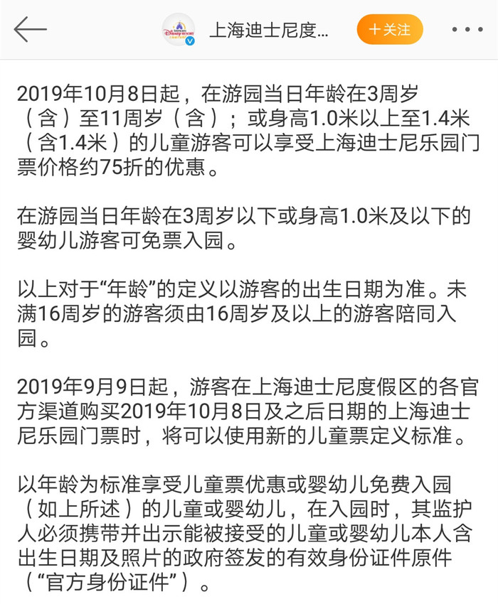 除此之外,前几日,@上海迪士尼度假区 发布消息称从10月8日起,儿童票将兼顾年龄和身高。