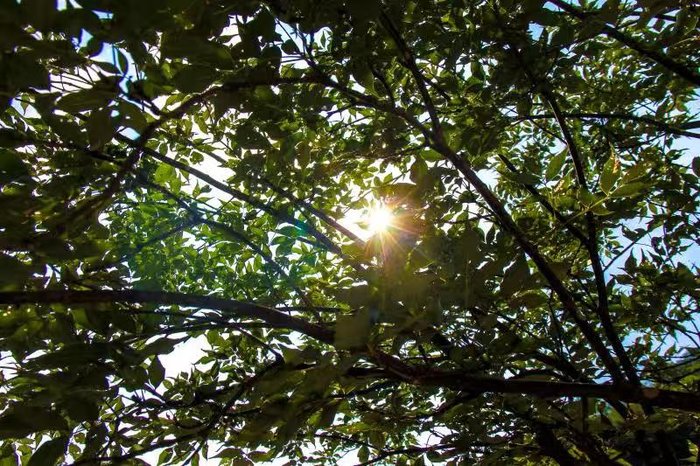 茂密的枝叶间,阳光散落,光影斑驳。环视周围,奇峰险峻,小动物在树林间穿梭,蜻蜓在花间环绕,一切看起来和谐美好。